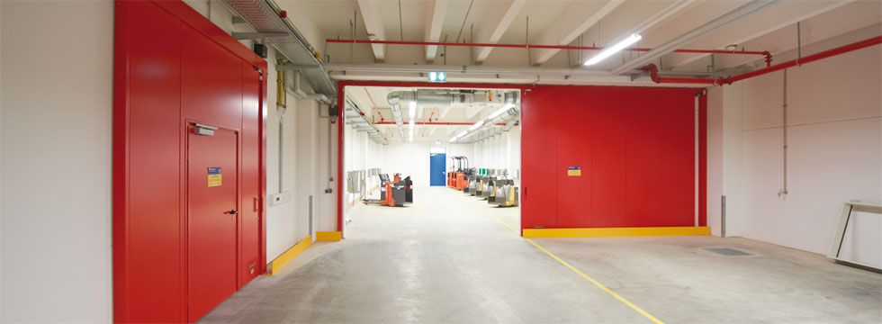 Огнестойкие конструкции прошли испытания в соответствии со стандартом DIN 4102, за их качеством постоянно следит Лаборатория испытаний строительных материалов в Брауншвейге, они допущены к эксплуатации Немецким институтом строительной техники (Deutsches Institut für Bautechnik, DIBt). Дымонепроницаемые огнестойкие откатные ворота для надежных и безопасных запасных выходов и эвакуационных путей также имеют сертификат соответствия стандарту DIN 18095. Мы рекомендуем применение данных ворот во всех зонах, в которых часто бывает много людей, когда в случае пожара необходимо защитить людей от распространения опасных для жизни дыма и газов. Для быстрого прохода людей и проезда с тележками для мешков или небольшими транспортными тележками мы предлагаем огнестойкие откатные ворота с калиткой/эвакуационной дверью. Калитки/эвакуационные двери в силу технических причин и требований противопожарной защиты оснащены верхними доводчиками.
